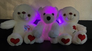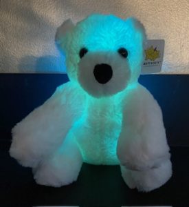 Deze beer is ongeveer 25 cm groot en geeft verschillende kleuren licht.